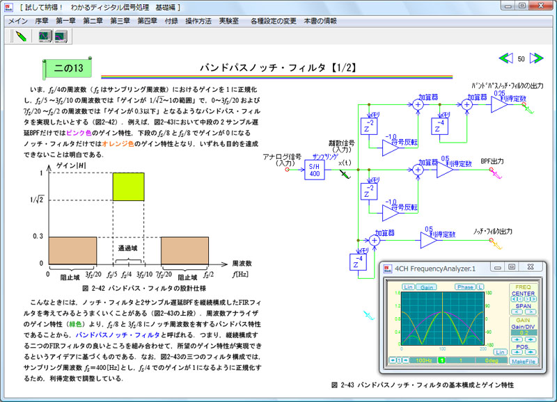 ディジタル信号処理の基礎であるFIR,IIRフィルタをマスターしたい方を対象に直感的にわかりやすく、 理解できるよう1項目に対し、1回路(ブロック図)をシミュレーションできるよう構成されています。実際に目で見てディジタル信号処理の動きを確かめられます。